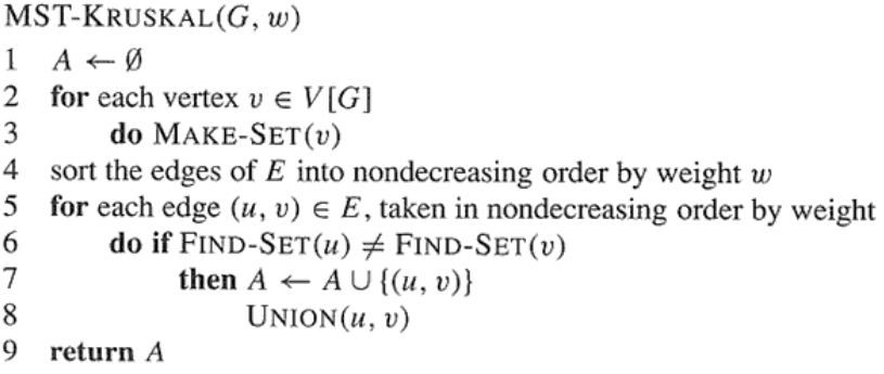 - 무향 가중치 그래프에서 신장 트리를 구성하는 간선들의 가중치의 합이 최소인 신장 트리