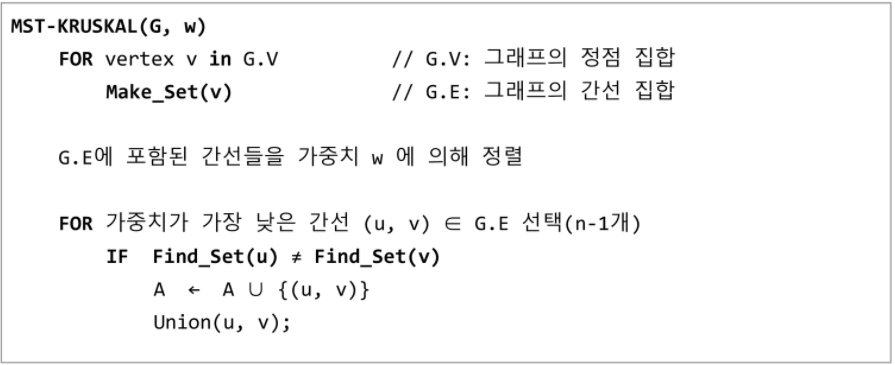 - 모든 정점을 연결하는 간선들의 가중치의 합이 최소가 되는 트리