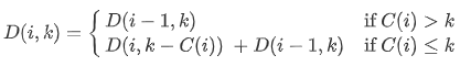 여기서 C(i)는 i번째로 고려할 코인의 가치이고, D(i, k)는 i번째 코인까지 사용해서 k를 만들 수 있는 경우의 수이다.